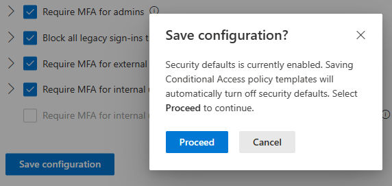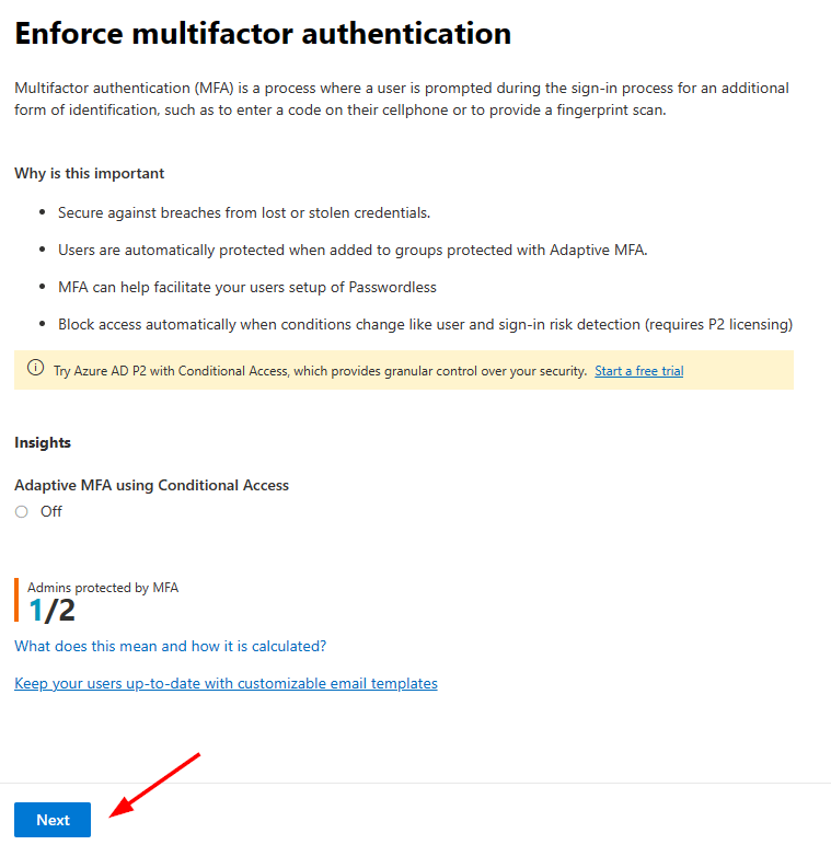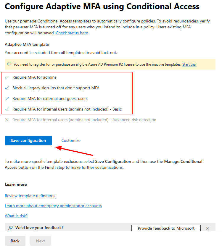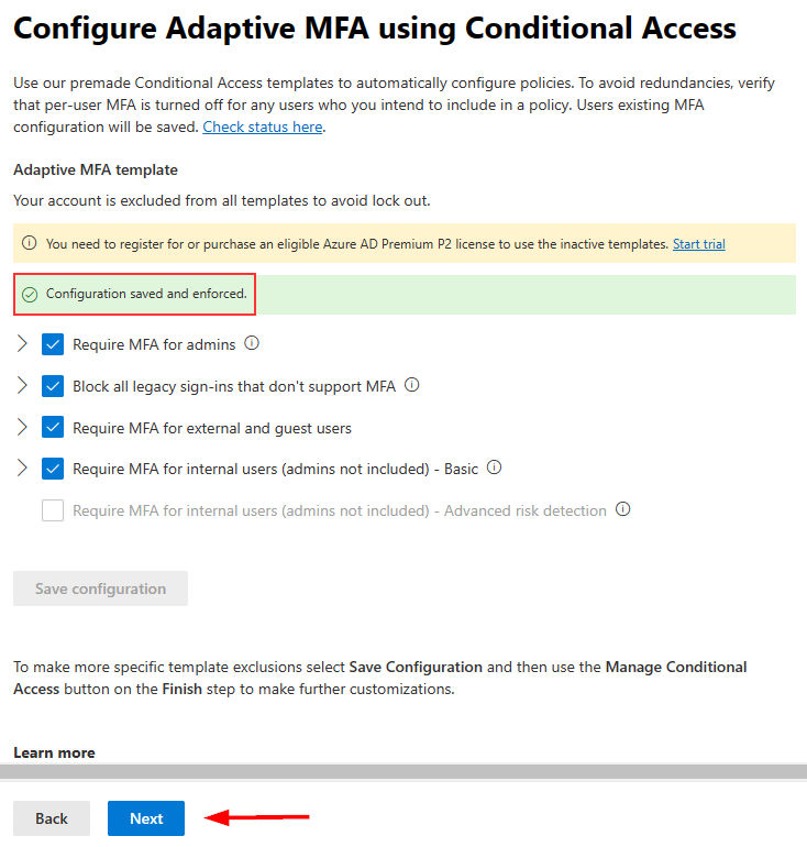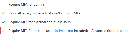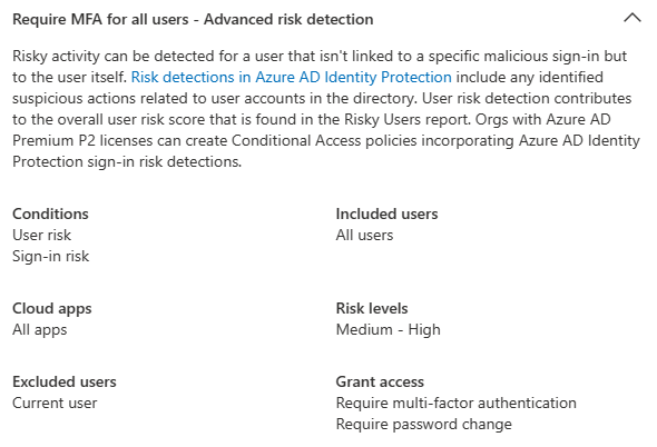 Side note: With the P2 License, it seems that the Require MFA for internal users – Basic is replaced with Advanced risk detection. The Advanced risk protection only applies MFA if a user is at Risk.