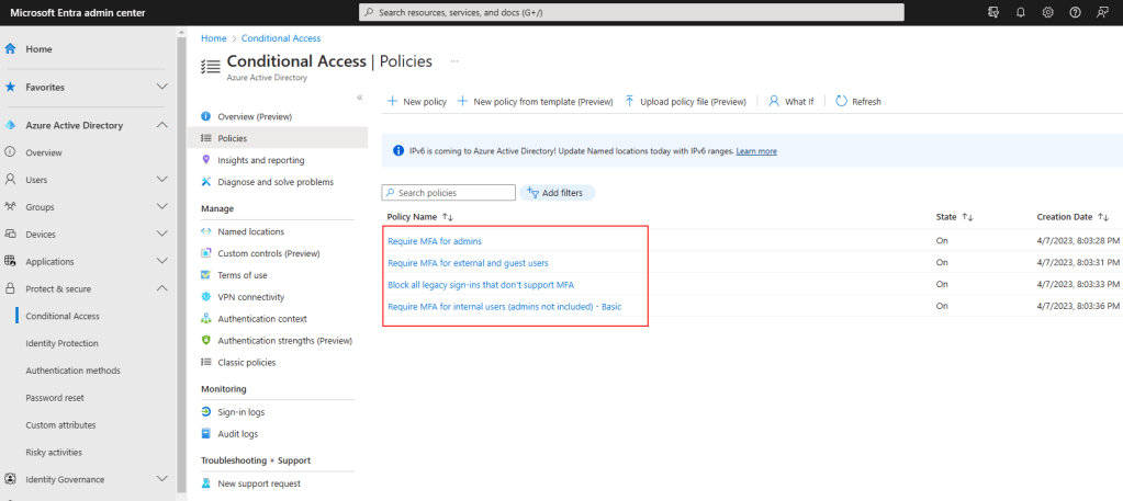 Once the policy is created, you will see in the Conditional Access that the Policies exist.
