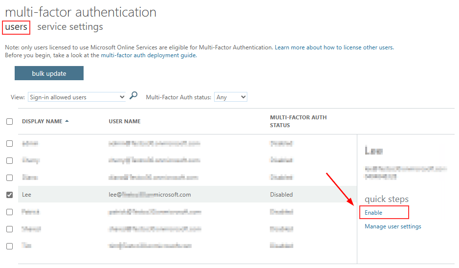 Selecting a user and clicking enable will not automatically ensure MFA is active. However, it will guide to register device (Moble) for MFA. Once this process is complete the setting will automatically change to from Enable to Enforce.