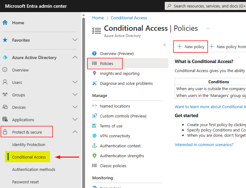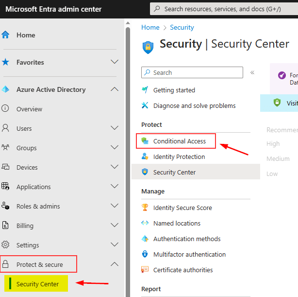 To access the Conditional Access, proceed to the Admin Center and under Protect and Secure will be Conditional Access