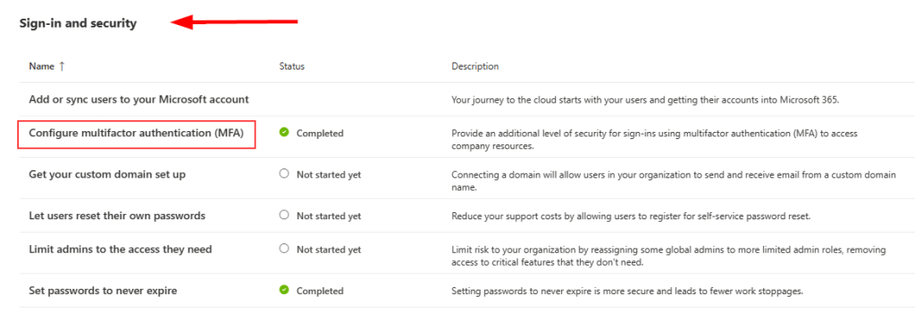 After selecting Setup, you can scrol down to Sign-in and Security and MFA: