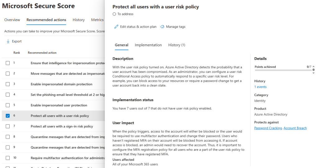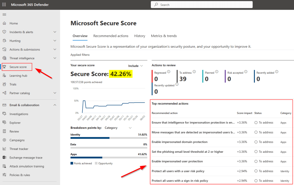 As with the example below, this score needs to be improved. Microsoft offers recommenedations on how this can be achived via the ‘Top Recommended Actions’ as highlighed below: