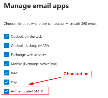 Manage user / Mail / Manage email apps / Authenticated SMTP